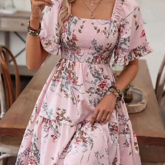 ✨2025 Hot Sale⌛Women’s Elegant Square Neck Floral Print Smocked Dress