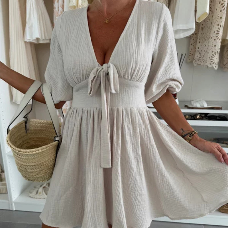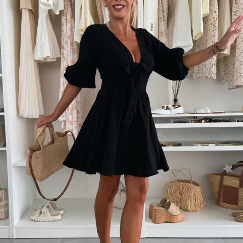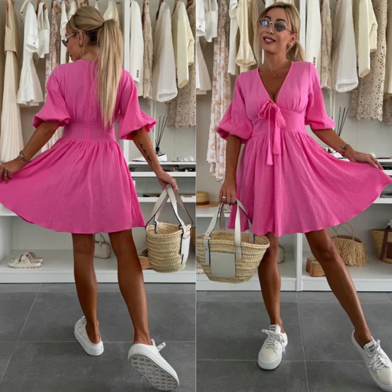 CHIC & VERSATILE DESIGN: This mini dress combines a flattering V-neckline with a solid color finish for a timeless look. The subtle yet stylish details make it perfect for casual outings, brunch dates, or even semi-formal occasions.